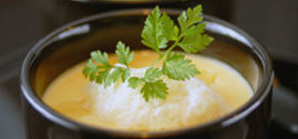 Cuire à frémissement pendant 10 minutes, mixez le tout et passez la préparation à travers un chinois, afin d’obtenir une crème lisse.